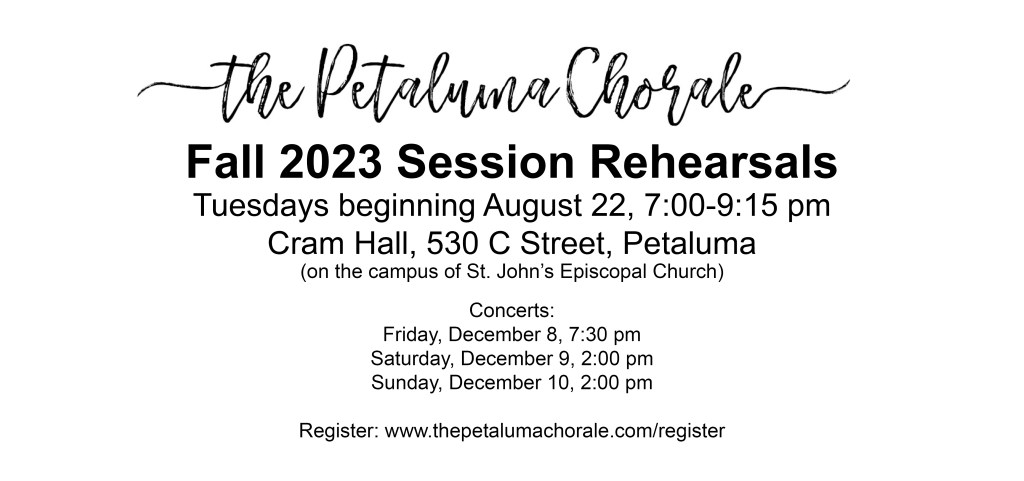 The Petaluma Chorale is a mixed vocal ensemble dedicated to the art of superior choral singing, including formal, jazz, Broadway and other contemporary styles. The Petaluma Chorale presents biannual concerts in the Fall and Spring. New members are always welcome! A simple audition is required for new members (or returning members who've not sung with group in two years or more) in order to place them into the proper section within the chorus. Ability to read music is helpful but not required. View more posts